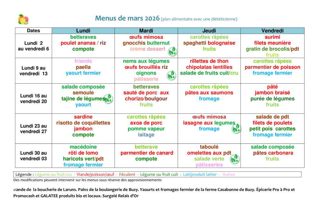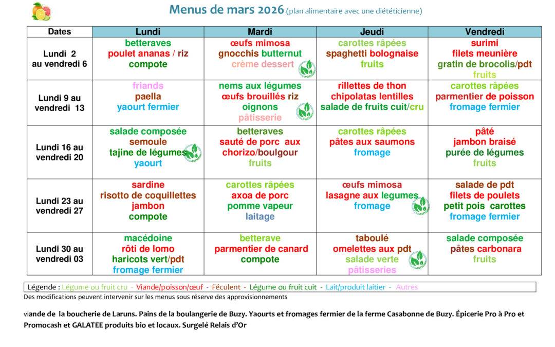 Cantine scolaire : menus du mois de mars par Mairie | 2 mars 2026 | Ecole (RPI Buzy-Buziet), Education / Jeunesse, Info / Actu, Vie Pratique | 0 commentaires