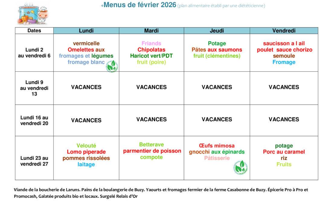 Cantine scolaire : menus pour le mois de février par Mairie | 2 février 2026 | Ecole (RPI Buzy-Buziet), Education / Jeunesse, Info / Actu, Vie Pratique | 0 commentaires